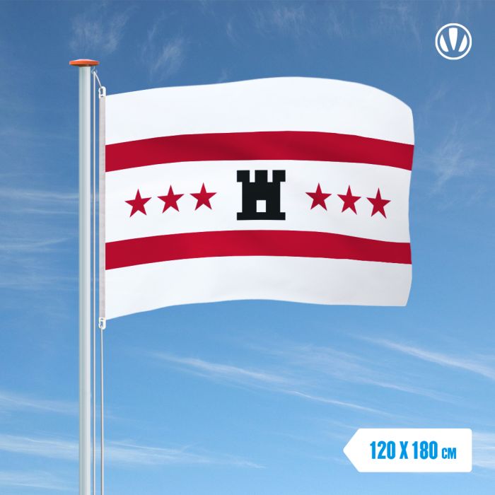 De vlag is gemaakt van glanspolyester wat zorgt dat de vlag mooi wappert in de wind. De vlag is kwalitatief afgewerkt met dubbele stiknaad en stevige vlaggenhaken en kan makkelijk bevestigd worden. Door het gebruik van glanspolyester is de vlag windsterk, kleurvast en UV-bestendig. Let wel op dat de vlag nergens tegen aan wappert om slijtage te voorkomen.