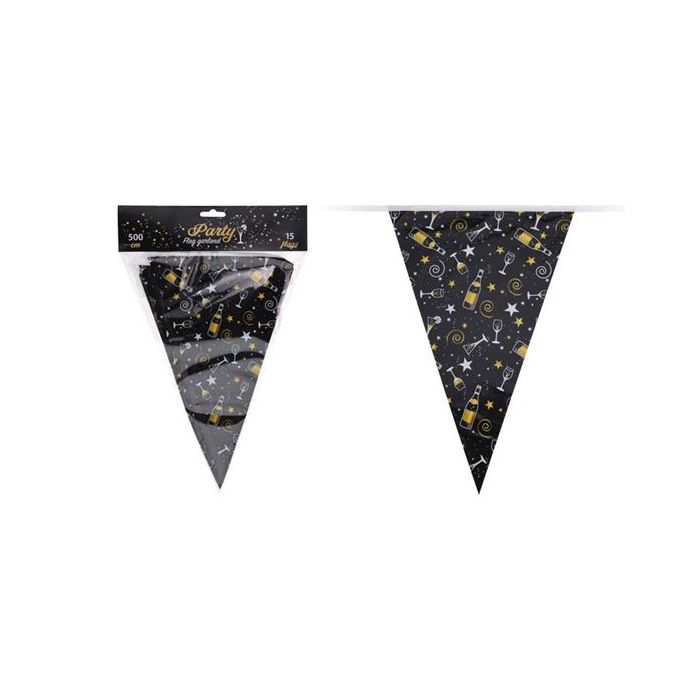Een knallende vlaggenlijn voor oud en nieuw met feestelijke gouden details. Zo versier je je oudjaarsfeestje helemaal in oud & nieuw thema. De vlaggenlijn is van zwart plastic met zilveren en gouden versieringen. De vlaggenlijn heeft 15 vlaggetjes en is 5 meter lang. We hebben niet alleen gezellige vlaggenlijnen voor oudjaarsavond maar ook leuke vlaggen, cocktailprikkers en andere gouden en zilveren versiersels.
